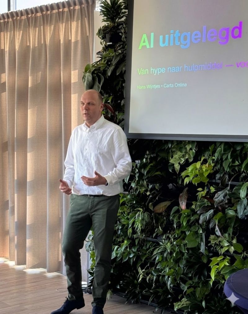 Opvallend was dat niemand in de zaal aangaf AI-beleid te hebben binnen zijn of haar organisatie. Dat betekent dat er in de meeste gevallen geen duidelijke afspraken bestaan over wat medewerkers wel of niet naar een AI mogen sturen. Denk hierbij aan persoonsgegevens, vertrouwelijke documenten of namen van klanten. Ook regulatie van de output is van belang. Wie draagt bijvoorbeeld verantwoordelijkheid? En mag je dingen zo overnemen van AI? Controle blijft daarom essentieel. Bij Carta Online is er een start gemaakt met AI-beleid; medewerkers van Carta gebruiken enkel Claude en worden daarin gefaciliteerd.